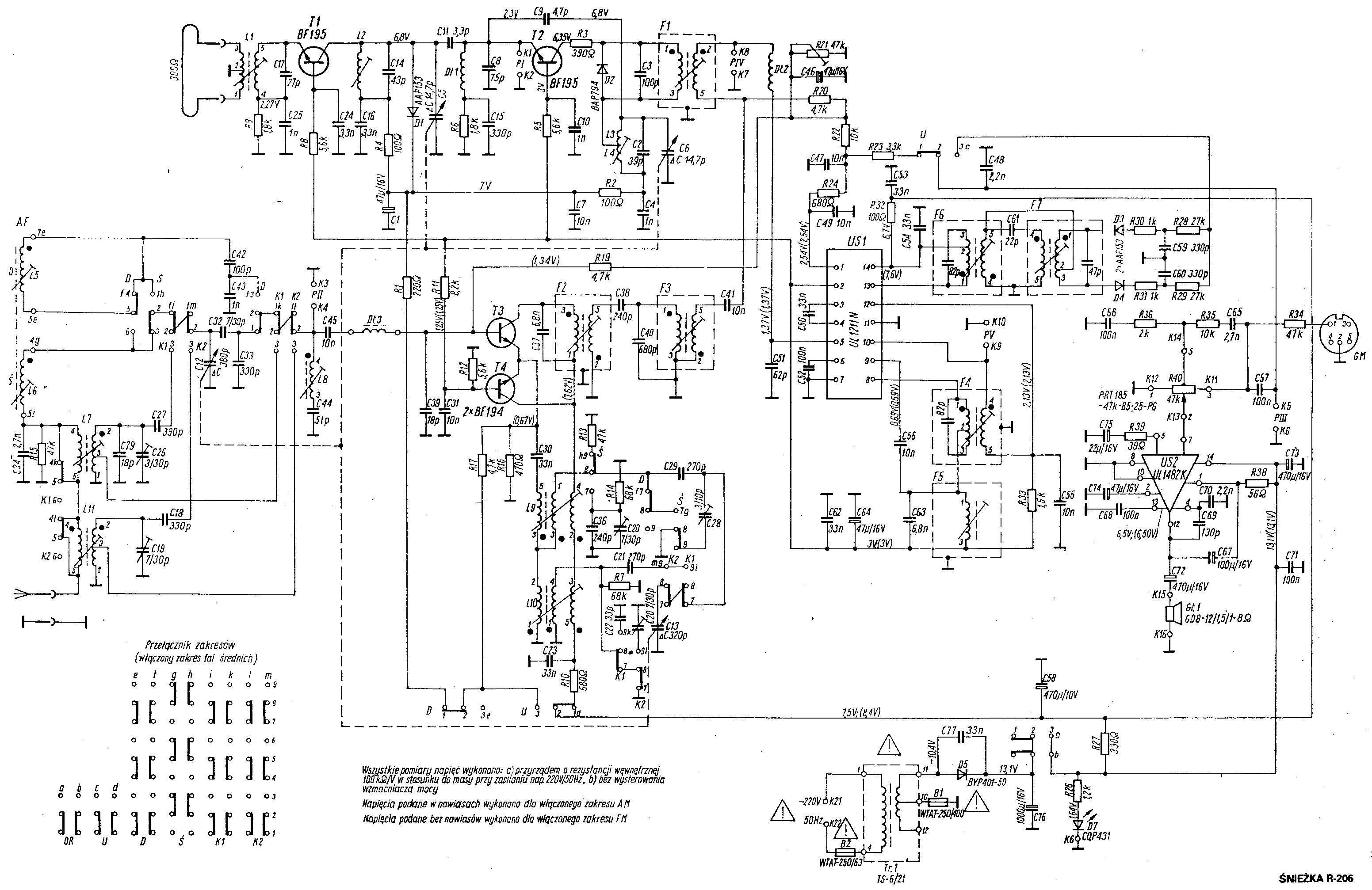 W stopniu końcowym zastosowano wzmacniacz na układzie scalonym UL1482K, małej mocy (1,6W), bez radiatora, przeznaczonym dla odbiorników bateryjnych. Ma on dobre tłumienie tętnień sieciowych, co pozwoliło na zastosowanie prostownika jednopołówkowego w zasilaczu. Układ UL1482 występuje w odbiornikach stacjonarnych oprócz Śnieżki tylko w odbiornikach Pionier Re101 i Pionier Re105 a w przenośnych w trzech modelach z Unitra Rzeszów.