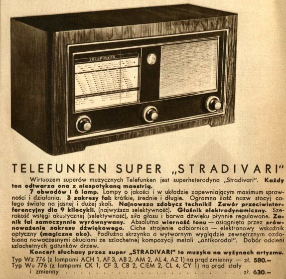 Superheterodyna 7-obwodowa z ARW. Regulacja barwy tonu, głośnik dynamiczny. Skrzynka orzechowa. Elektronowy wskaźnik dostrojenia. Cena 630zł