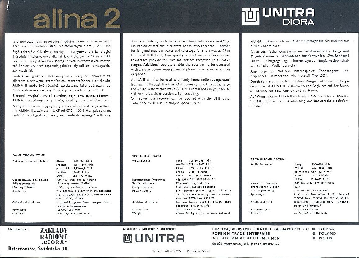 Z ulotki reklamowej: Alina II jest nowoczesnym, przenośnym odbiornikiem radiowym przeznaczonym do odbioru stacji radiofonicznych o emisji AM i FM.
