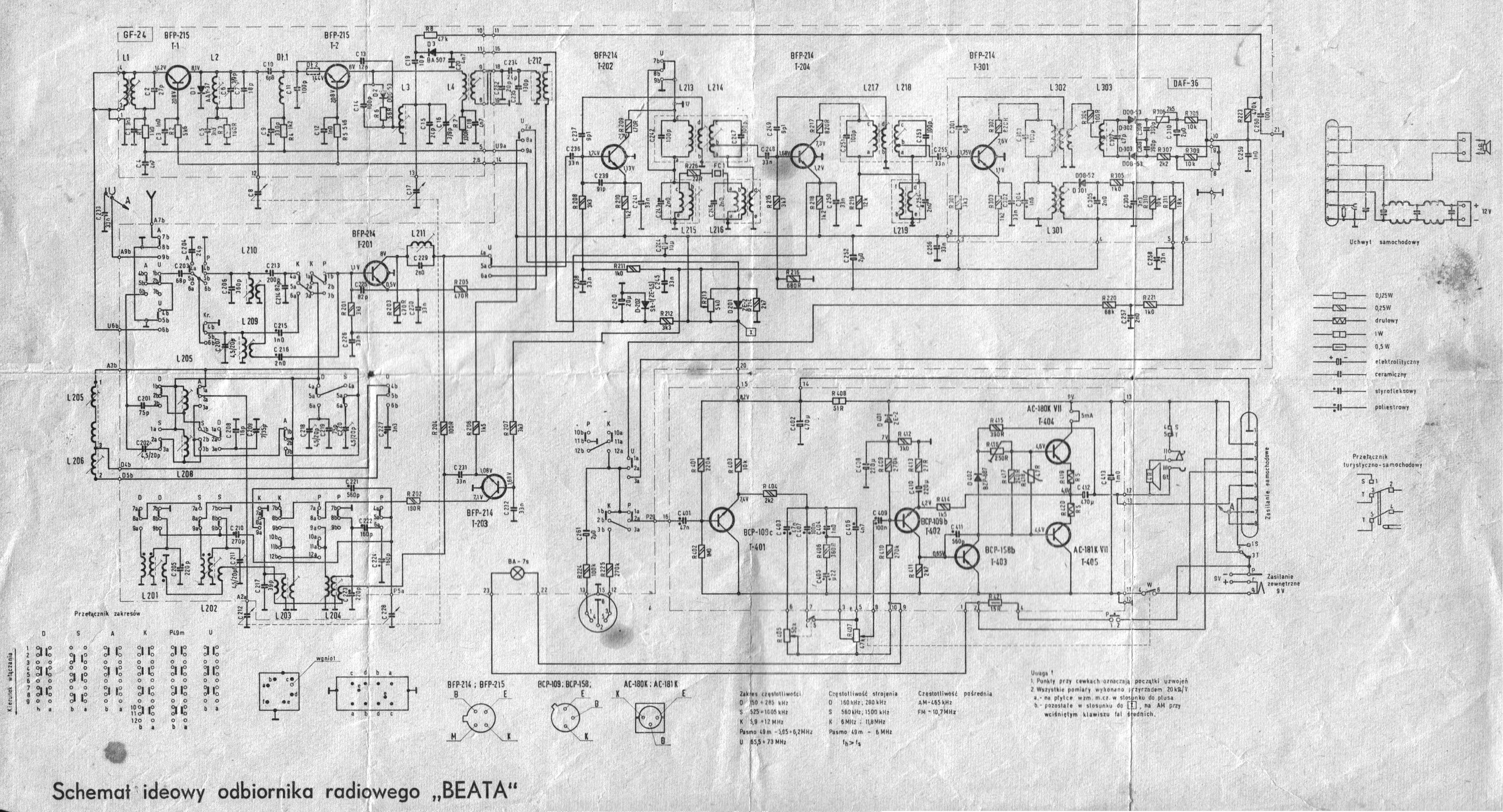 Odbiornik wyposażony jest w dwie anteny - ferrytową dla fal długich i średnich oraz teleskopową [....], automatyczną regulację częstotliwości na UKF, regulacje barwy dźwięku, klawiszowy przełącznik zakresów i dodatkowe gniazda do podłączenia uchwytu samochodowego, słuchawki, gramofonu, magnetofonu i zasilacza sieciowego. [....]