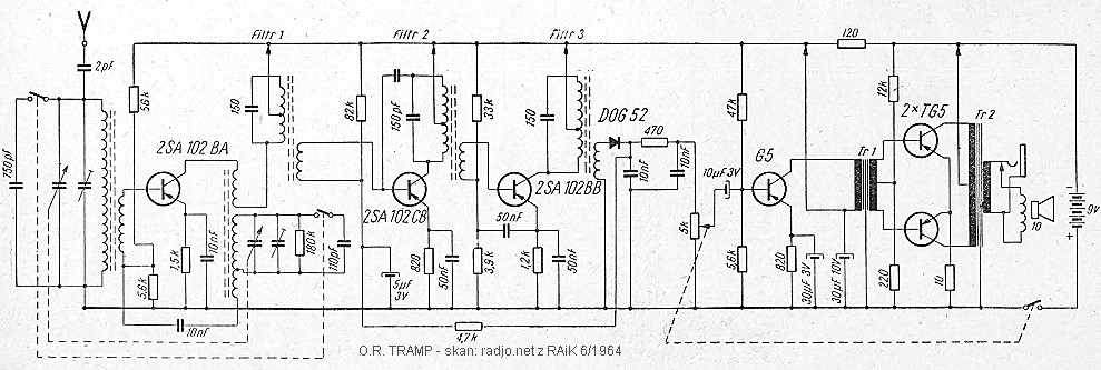 TRAMP, opisany po raz pierwszy w RAiK 6/1964 "Subminiaturowy odbiornik tranzystorowy", był w tym czasie chlubą polskiej radiotechniki. Wprawdzie w torze w.cz. i p.cz. zastosowano japońskie tranzystory typu 2SA102, japońskie były również filtry p.cz. i prawie wszystkie kondensatory ale już zapowiadano: "na podkreślenie zasługuje fakt, że w niedługim czasie TRAMP będzie produkowany z polskich podzespołów subminiaturowych, nie ustępujących dotychczas stosowanym podzespołom japońskim". Do zasilania zastosowano wprowadzoną właśnie do produkcji baterię 9-woltową (Centra typ EF-20). Na jednym ze zdjęć do porównania wielkości odbiornika posłużyła chluba polskiego przemysłu tytoniowego lat 60-tych, papierosy "Silesia".
