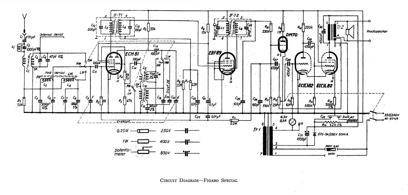 Wersja Radia Figaro eksportowana do Wielkiej Brytanii. Skala i opisy w języku angielskim, napięcie zasilające 220V lub 240V obniżane autotransformatorem. Nie posiada wewnętrznej anteny fal krótkich umieszczonej na schematach innych wersji radia Figaro. Prostownik selenowy SPS5A i kilka kondensatorów jest datowanych 62r co prawdopodobnie świadczy o roku produkcji radioodbiornika.