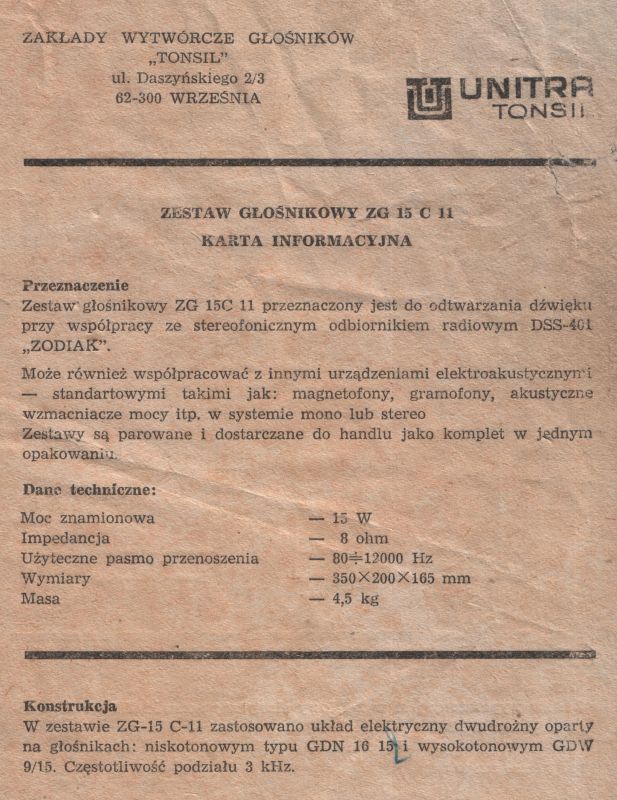 Zestaw głośnikowy przeznaczany do współpracy z stereofonicznym radioodbiornikiem DSS-401 „ZODIAK”