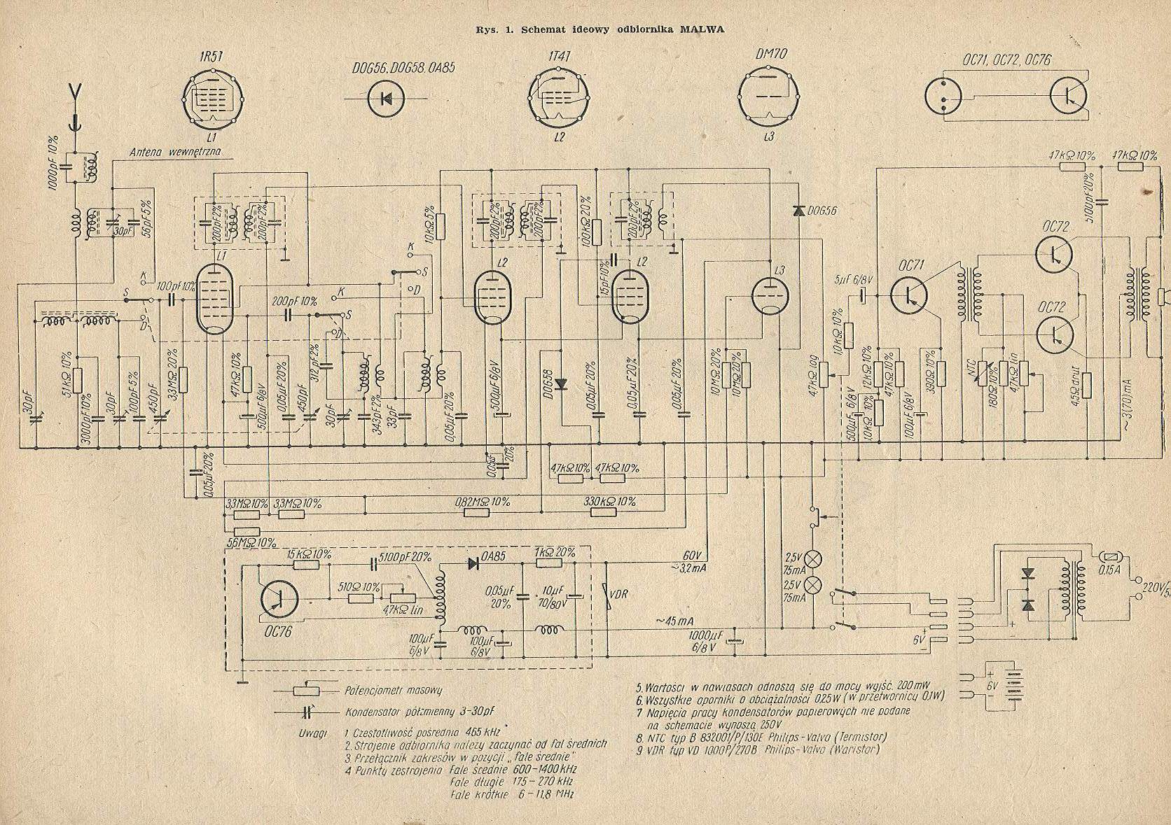 Jasne gałki, małe oczko magiczne obok siły głosu, przełącznik zakresów obrotowy. Jasny napis Malwa na fornirowanej listwie pod skalą.