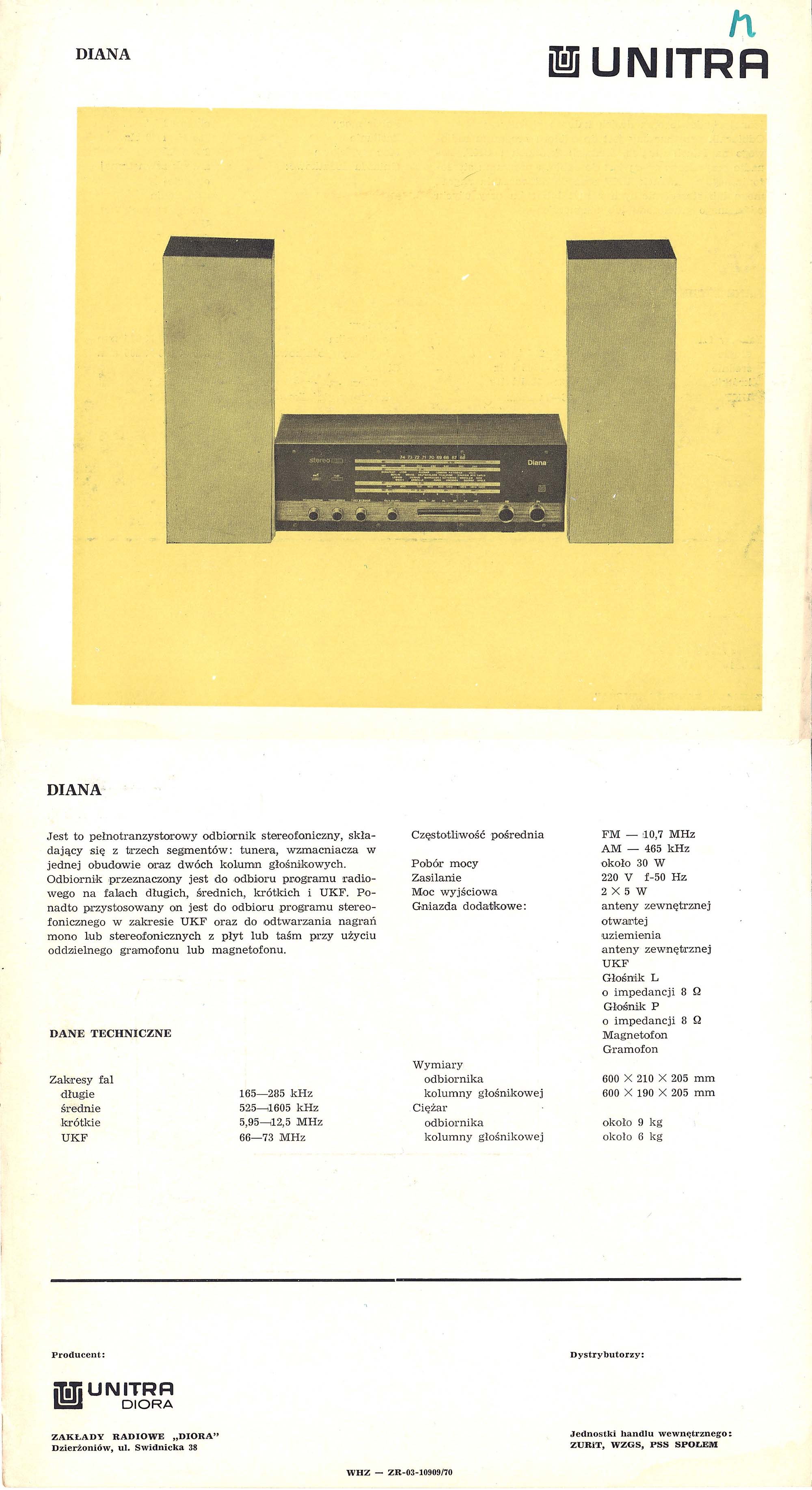 Odbiornik prezentowany na 40 MTP w 1971 r. Jesienią 1971 r. załoga Diory dla uczczenia VI Zjazdu PZPR podjęła się przyspieszyć rozpoczęcie produkcji Diany o jeden kwartał.