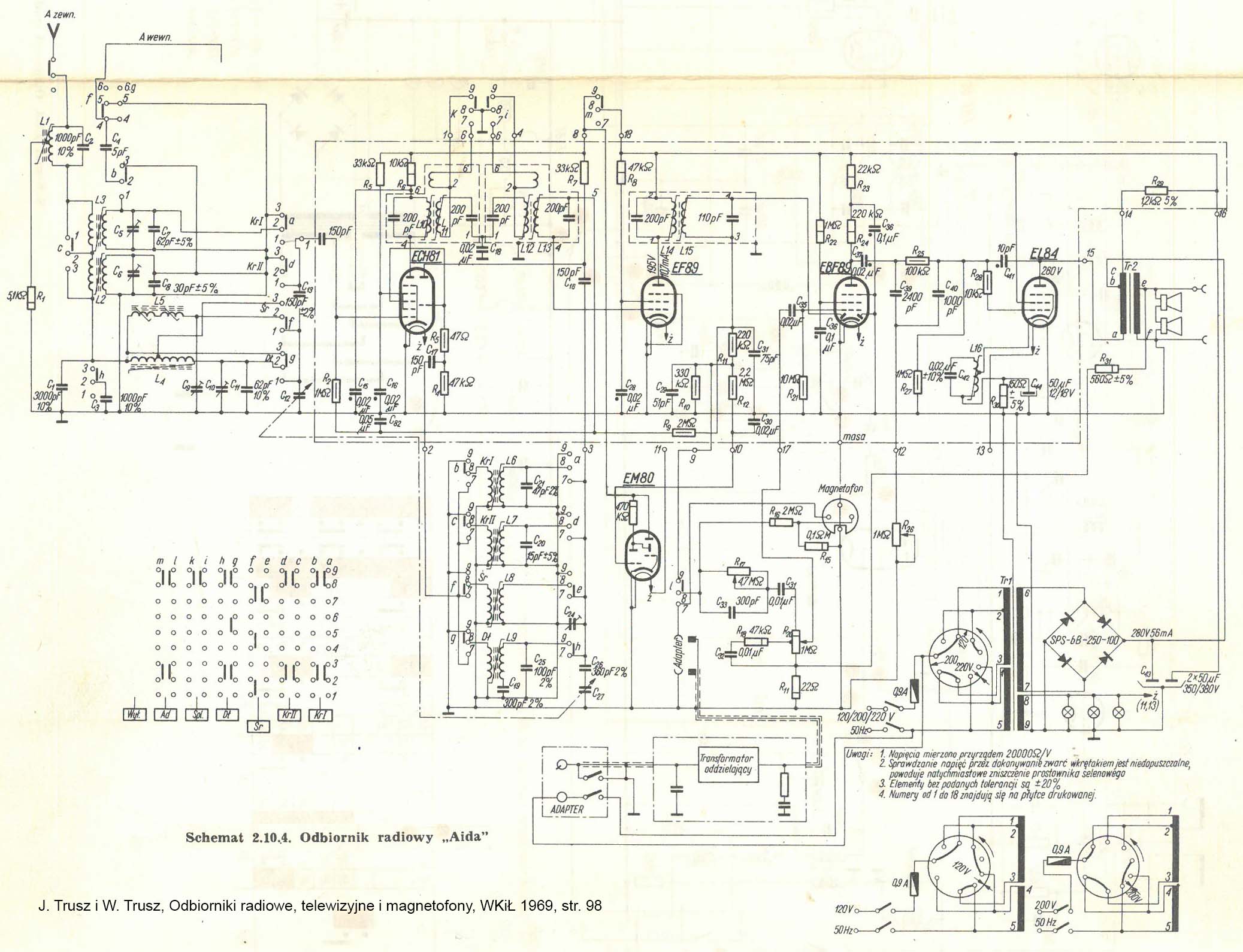 Wbudowany gramofon Ziphona P10-33 z wkładką magnetyczną, importowany z NRD. Układ elektryczny jak Tatry. Dwa głośniki po bokach. Wielka ramka z jasnego plastiku wokół skali, na całą ścianę czołową. W ramce magiczne oko. Antena ferrytowa obracana jedną z przednich gałek. Niezależna regulacja tonów niskich i wysokich, wraz ze wskaźnikami. Klawisz "SEL" do rozszerzania pasma. Prostownik selenowy, mostkowy.