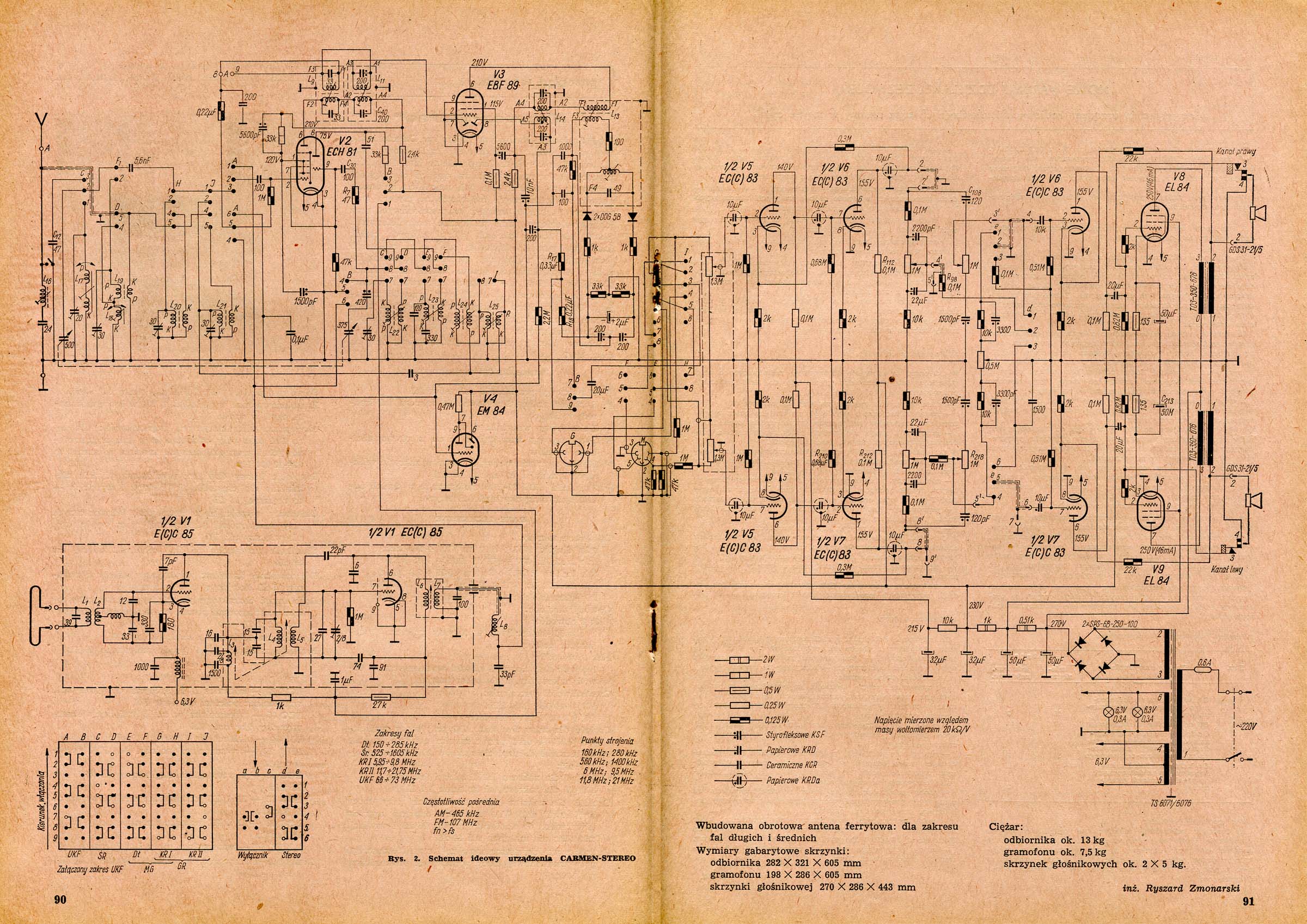 Dwa głośniki typu GDS 31-21/5 w oddzielnych kolumnach. Antena ferrytowa obrotowa, regulowana z poziomu skali. Obrócenie gałki do oporu w prawo powoduje przełączenie na antenę zewnętrzną.