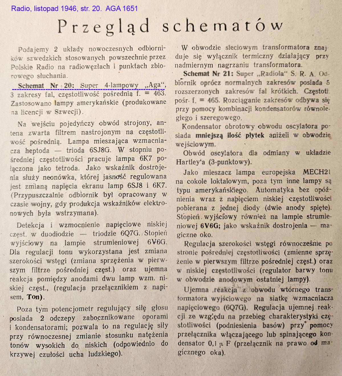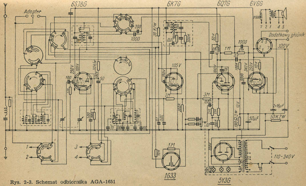 Aga 1651 to sześcioobwodowa superheterodyna z ARW i regulacja szerokości pasma. Odbiornik ma trzy zakresy (plus pozycja przełącznika dla stacji lokalnej). Regulacja szerokości pasma (selektywności) odbywa się w sposób skokowy i połączona jest z regulacja barwy tonu. W transformatorze sieciowym zastosowano bezpiecznik termiczny.