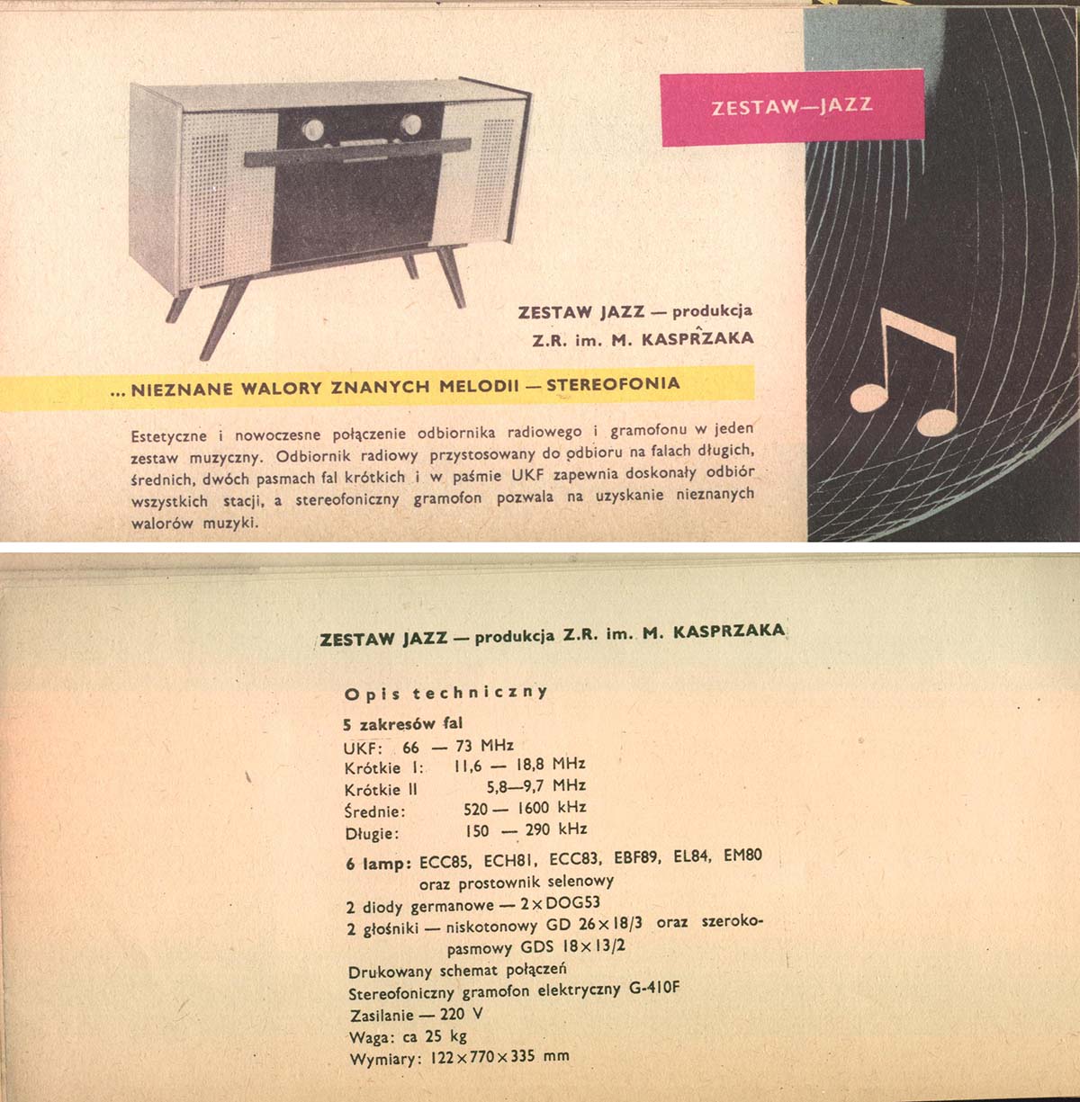 Radiola "Jazz" była po raz pierwszy prezentowana na XXXII Międzynarodowych Targach Poznańskich w 1963 r. Ulotka reklamowa przedstawiała urządzenie jako "zestaw stereofoniczny z wbudowanym gramofonem G-410f oraz głośnikiem niskotonowym i szerokopasmowym".