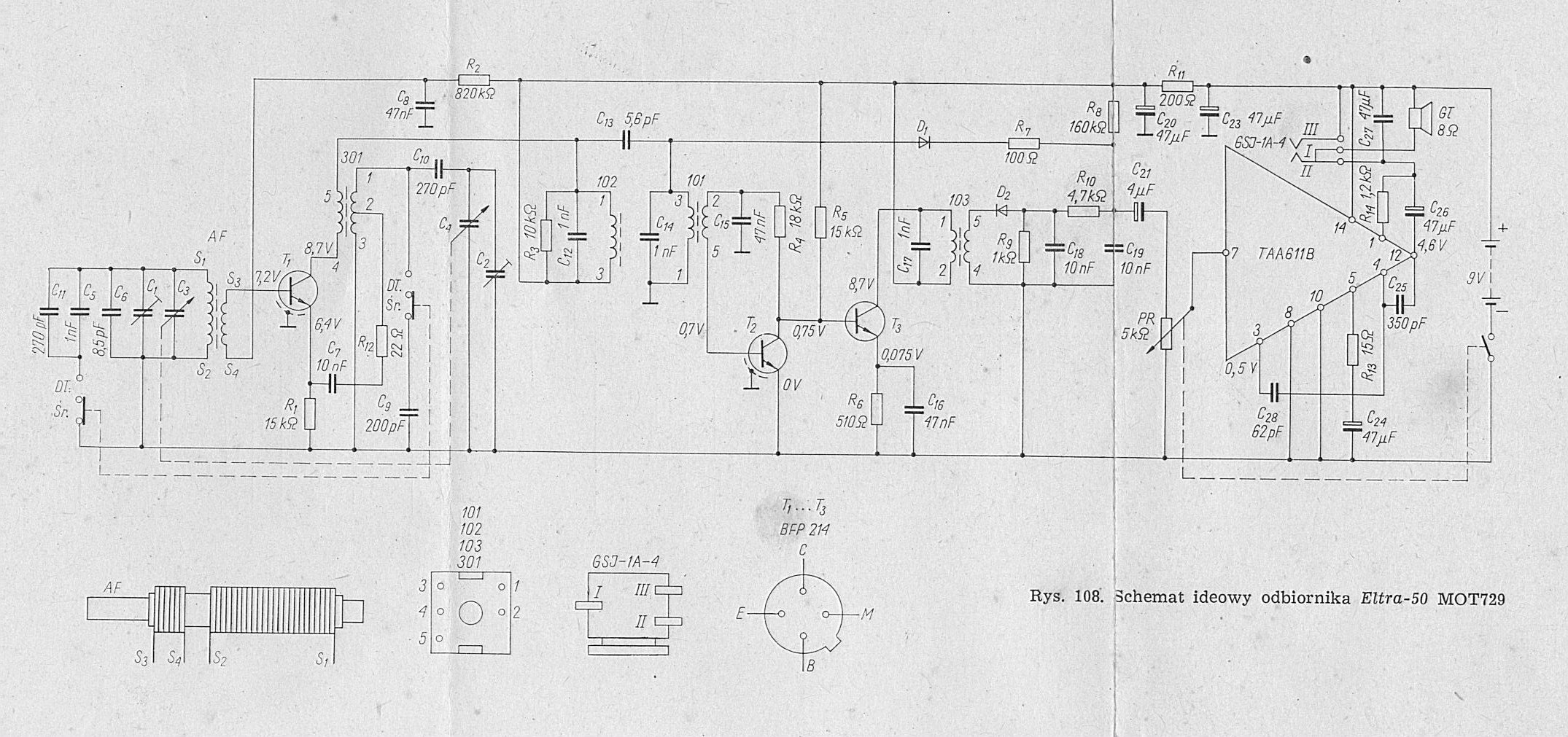Fale średnie - pełny zakres od 525 do 1600 kHz. Na tylnej ściance przełącznik zakresów i gniazdo słuchawkowe.