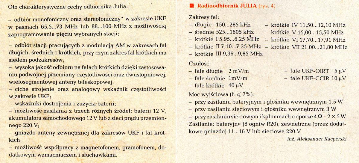 Warto zwrócić uwagę, że Julia nie została nazwana odbiornikiem "przenośnym", lecz "przestawnym", co przy jej ciężarze jest uzasadnione.
