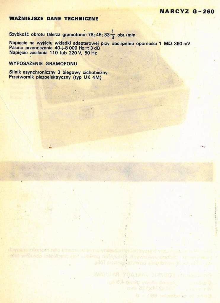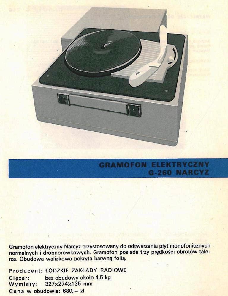 Przenośny, monofoniczny gramofon elektryczny bez wzmacniacza. Zabudowa walizkowa mechanizmu G-260. Układ elektryczny oparty o GE-56.
