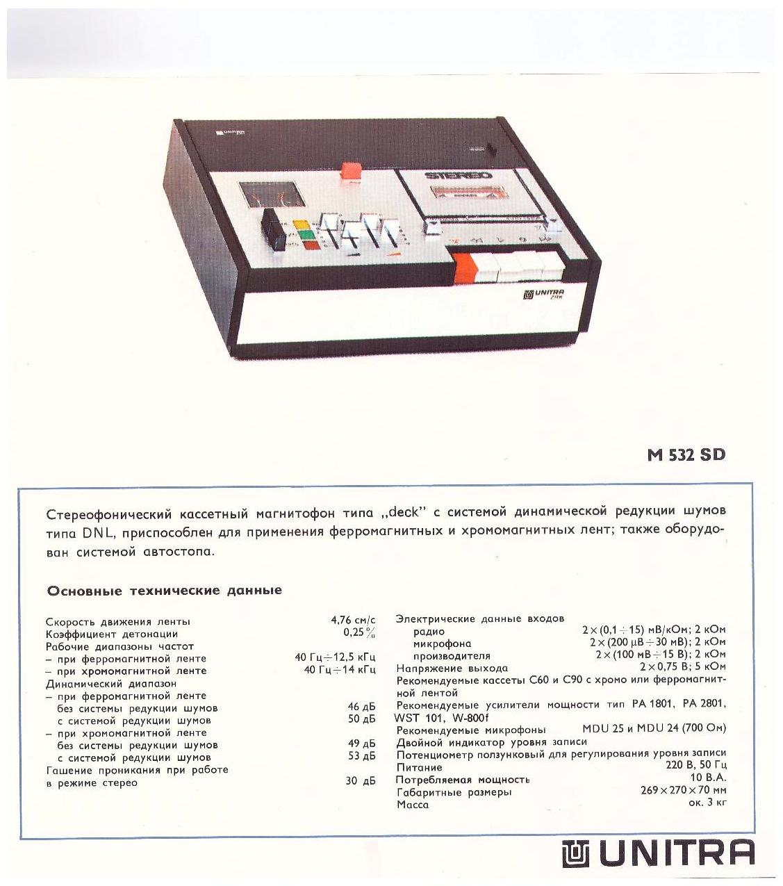 Kasetowy magnetodon stacjonarny, stereofoniczny, bez wzmacniacza. Może pracować z taśmą żelazową lub chromową. Układ redukcji szumów DNL. Przy przełącznikach lampki sygnalizujące rodzaj wybranej taśmy i włączoną redukcję szumów. Dwie pary potencjometrów suwakowych. Jedna do regulacji poziomu zapisu, druga do regulacji głośności na wyjściu słuchawkowym. Na płycie czołowej także licznik przesuwu taśmy i magnetoelektryczne wskaźniki poziomu zapisu. Z tyłu gniazda: zasilania sieciowego, słuchawkowe, wyjście sygnałowe DIN, wejście sygnałowe DIN dla gramofonu piezoelektrycznego, radia, innego magnetofonu.