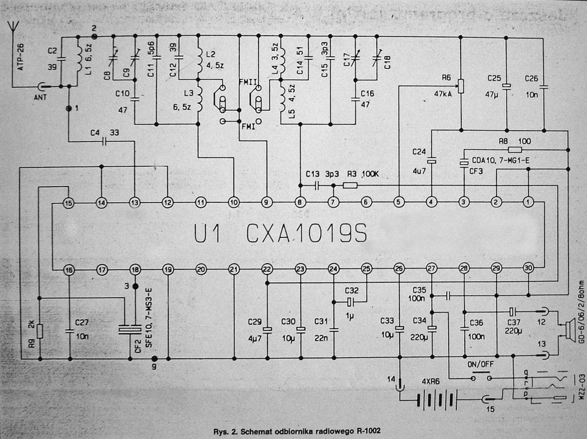 Liza. Układ elektryczny bardzo prosty z jednym tylko układem scalonym CXA-1019S (Sony) zawierającym w swojej strukturze kompletny odbiornik AM i FM ze wzmacniaczem m.cz. o mocy 250mW (część AM nie jest wykorzystana w odbiorniku R-1002 ). Odbiornik pojawił się także z innym oznaczeniem - jako LIZA 2.